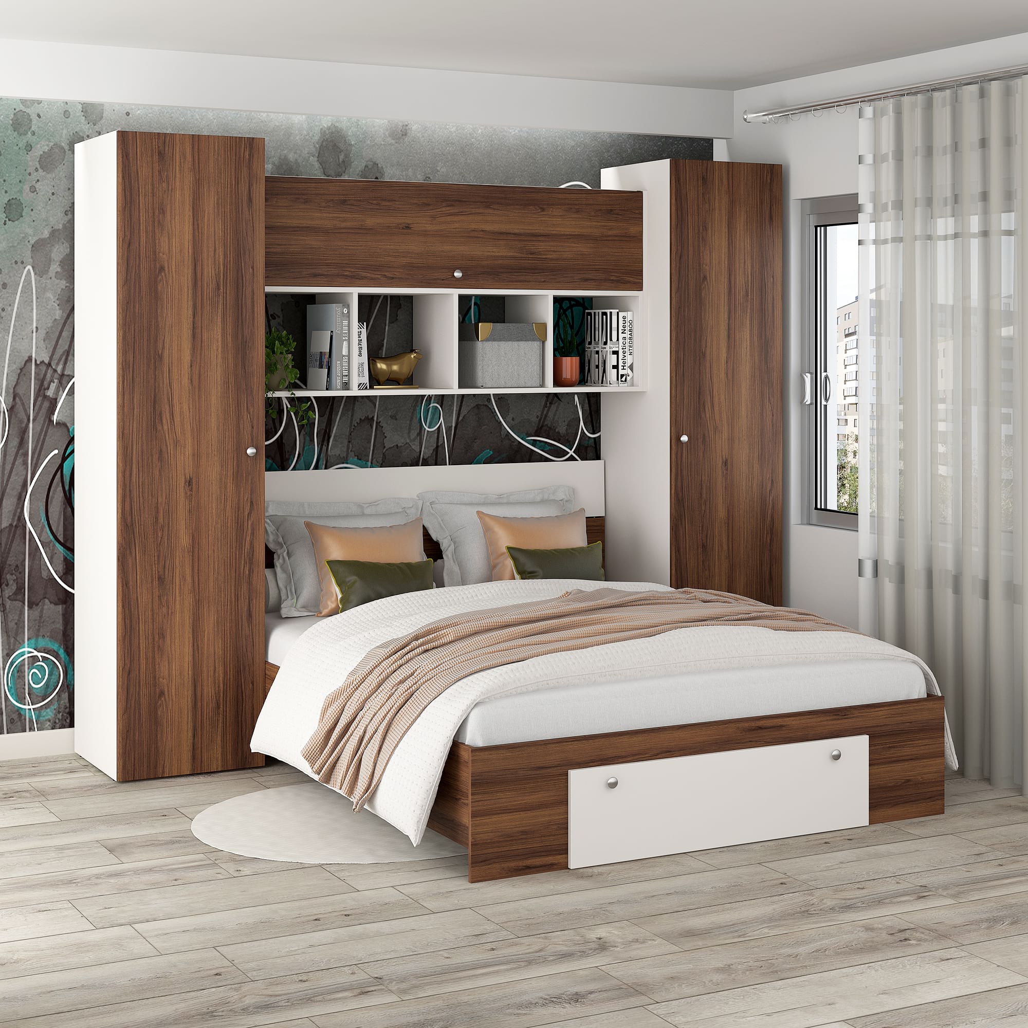 Dormitor ARONA 4, pat matrimonial sertar frontal, 4 dulapuri, Alb Portelan, Nuc Warmia