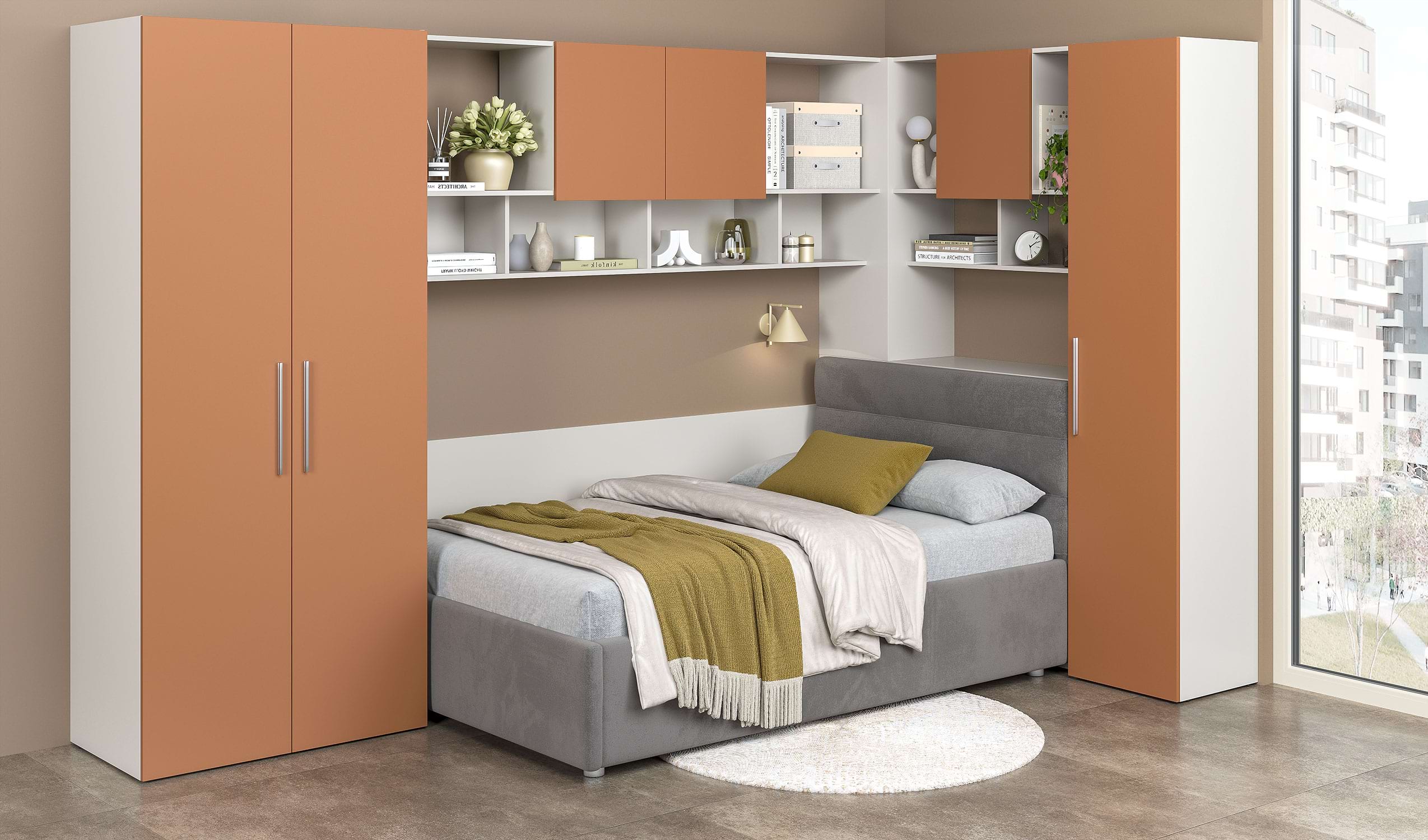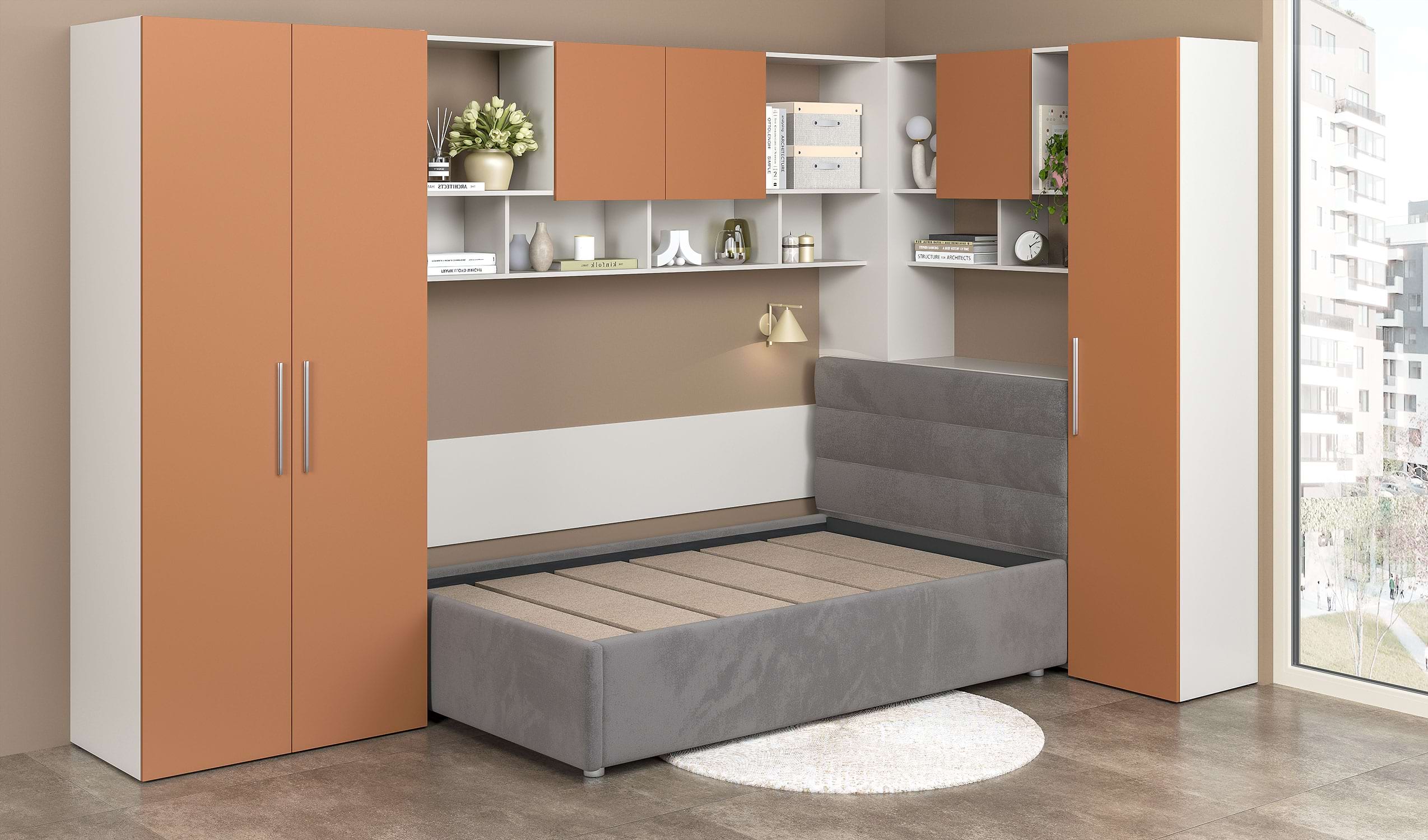 Dormitorul de colt cu pat tapitat ARONA 20, parte din colecția modulară ARONA, este un ansamblu de mobilier cu funcționalitate maxima in spatiu restrans, de regula cu amplasare pe colt dar nu numai, design modern, fiind ideal pentru camerele compacte.