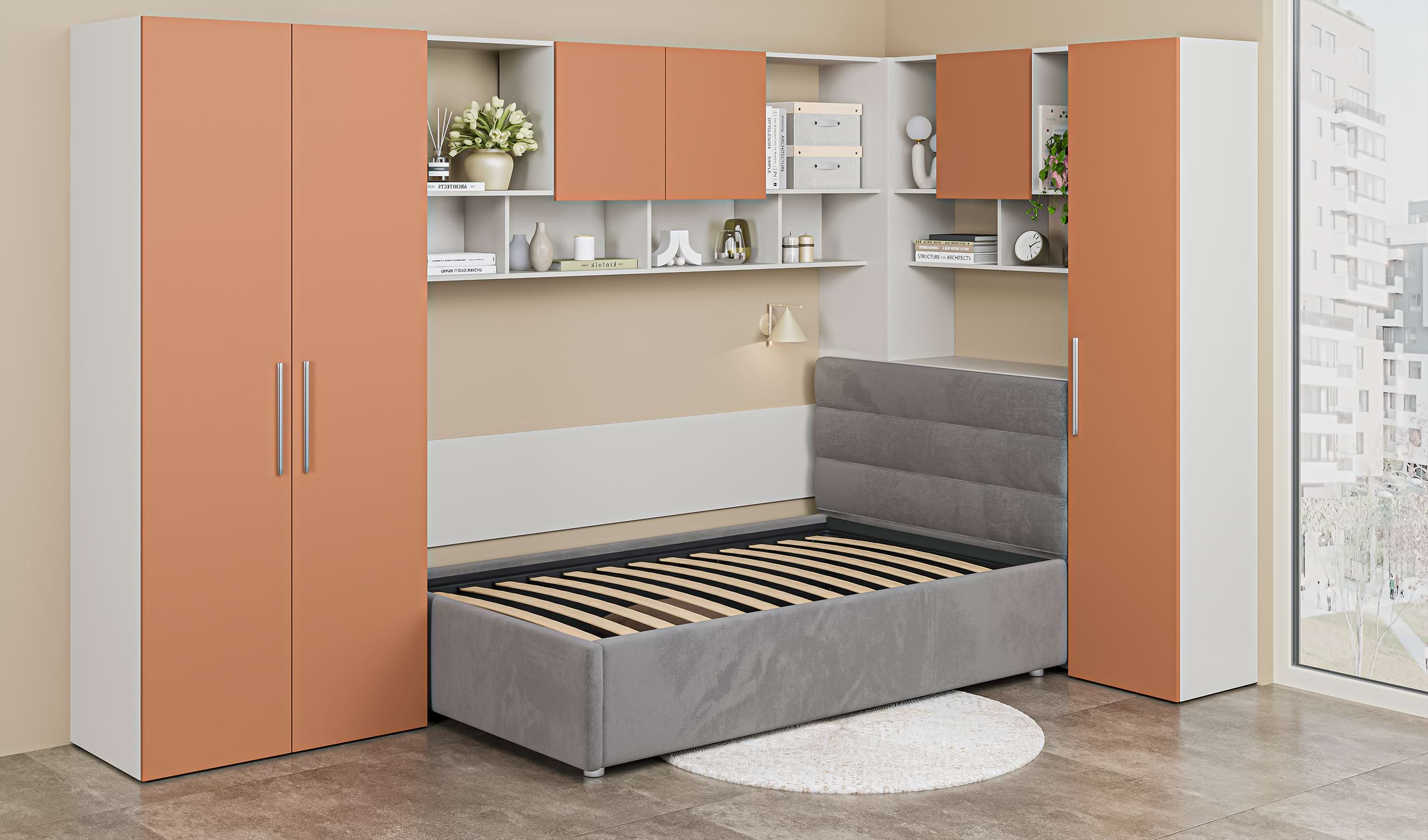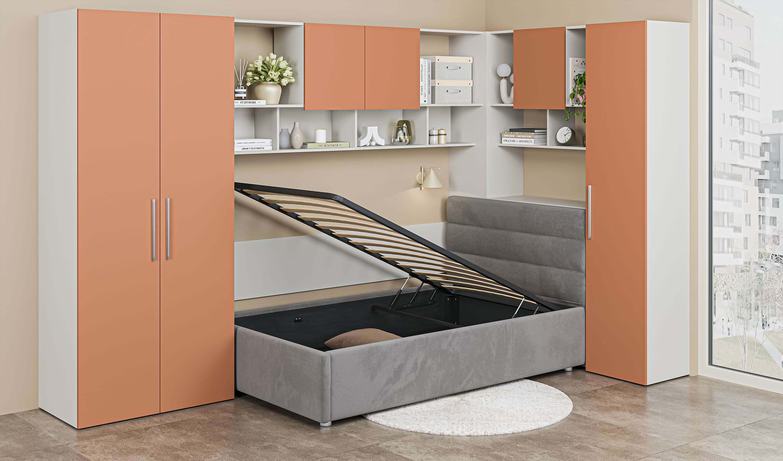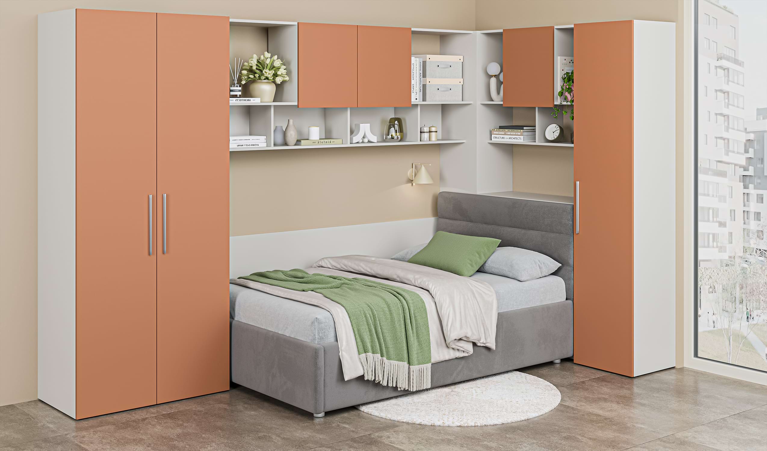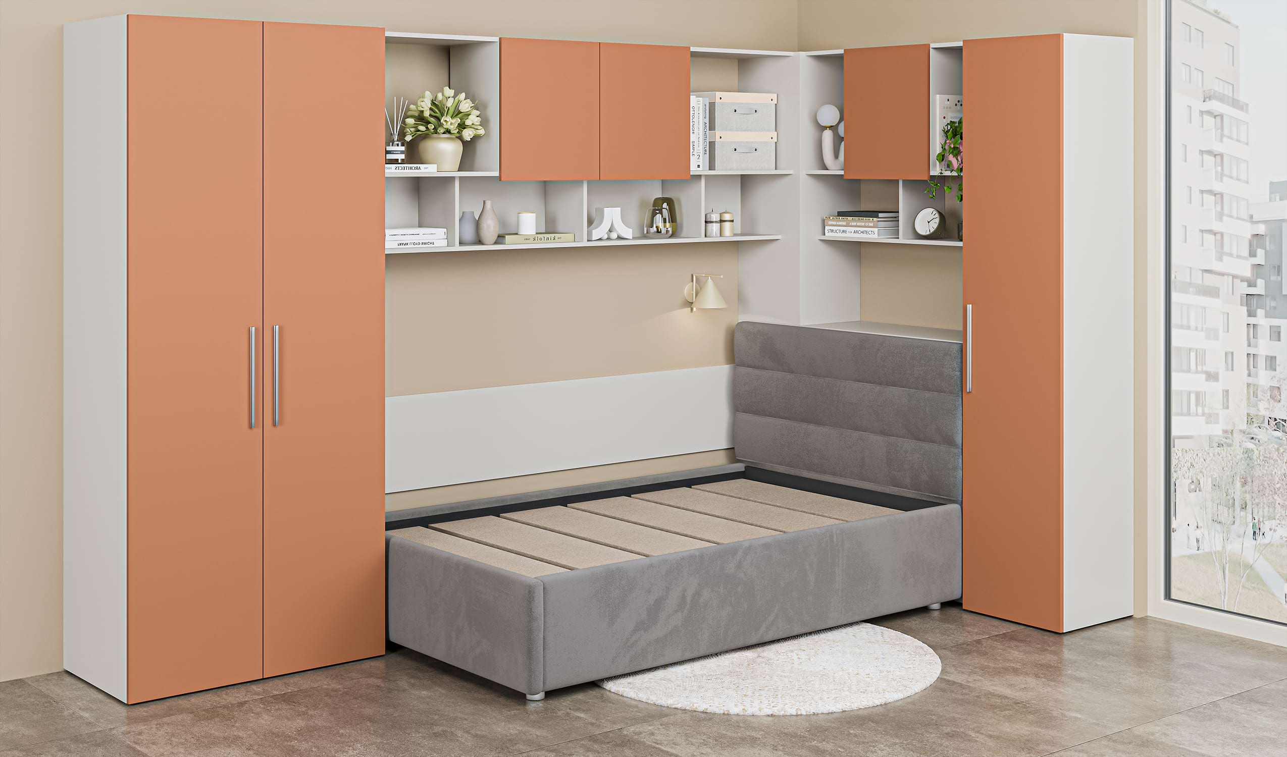 Dormitorul de colț cu pat tapițat ARONA 20, disponibil în combinația Alb Porțelan, Caramel (U830) și Catifea Grej R91, este o soluție completă pentru optimizarea spațiilor compacte. Designul modular ARONA îmbină funcționalitatea avansată cu o estetică modernă, caldă și primitoare.