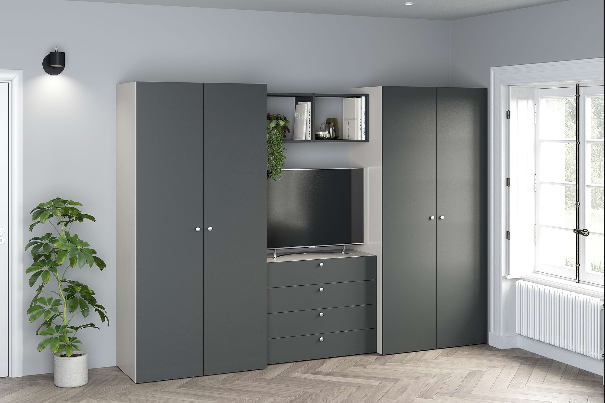 Dressing de dormitor ARONA A 270, A50, H195, 4U4S, Alb Poretlan, Antracit parte din colecția modulară ARONA, este un ansamblu de mobilier ce îmbină funcționalitatea cu un design modern.