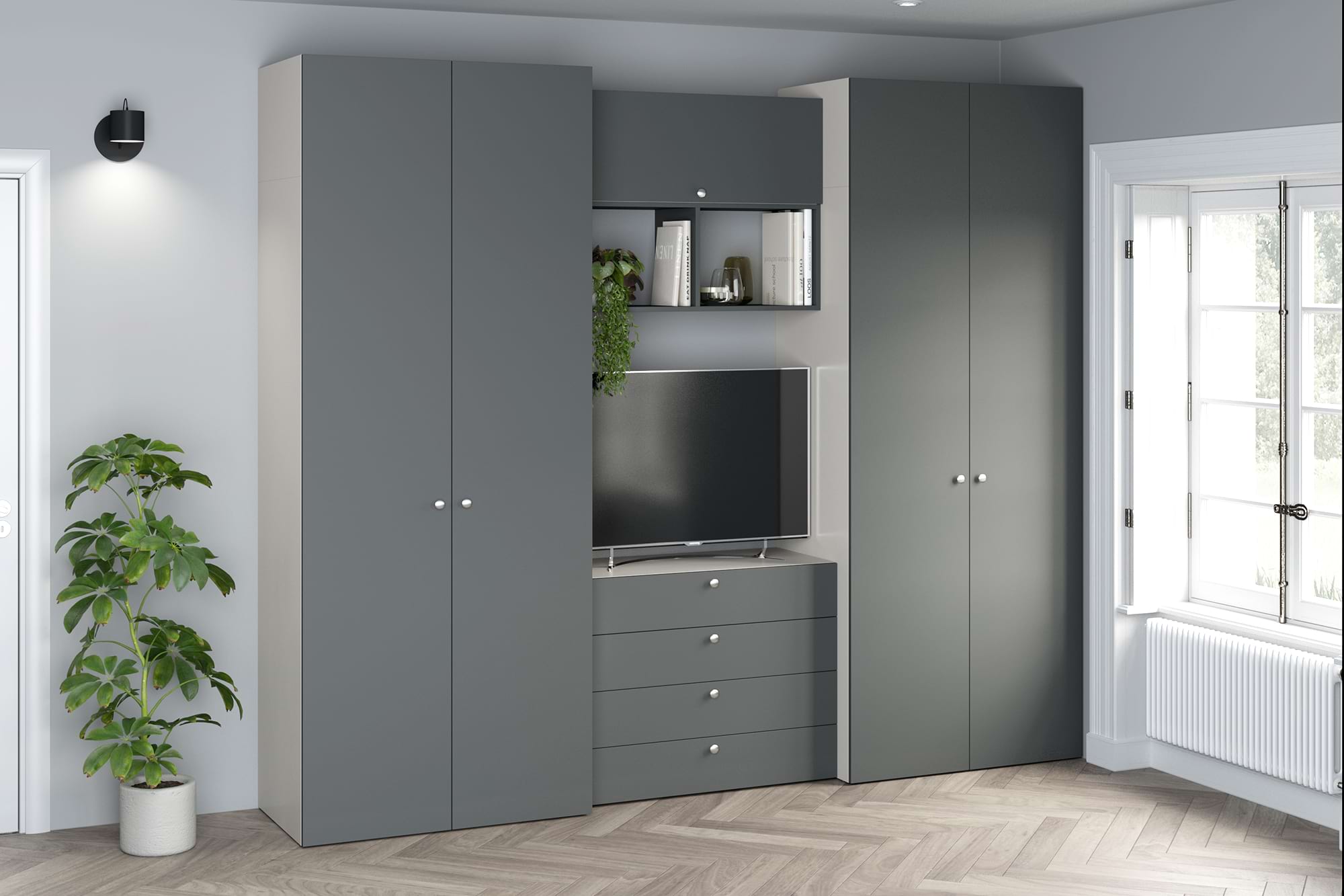 Dressing de dormitor ARONA A 270, A50, H230, 5U4S, Alb Portelan, Antracit parte din colecția modulară ARONA, este un ansamblu de mobilier ce îmbină funcționalitatea cu un design modern.