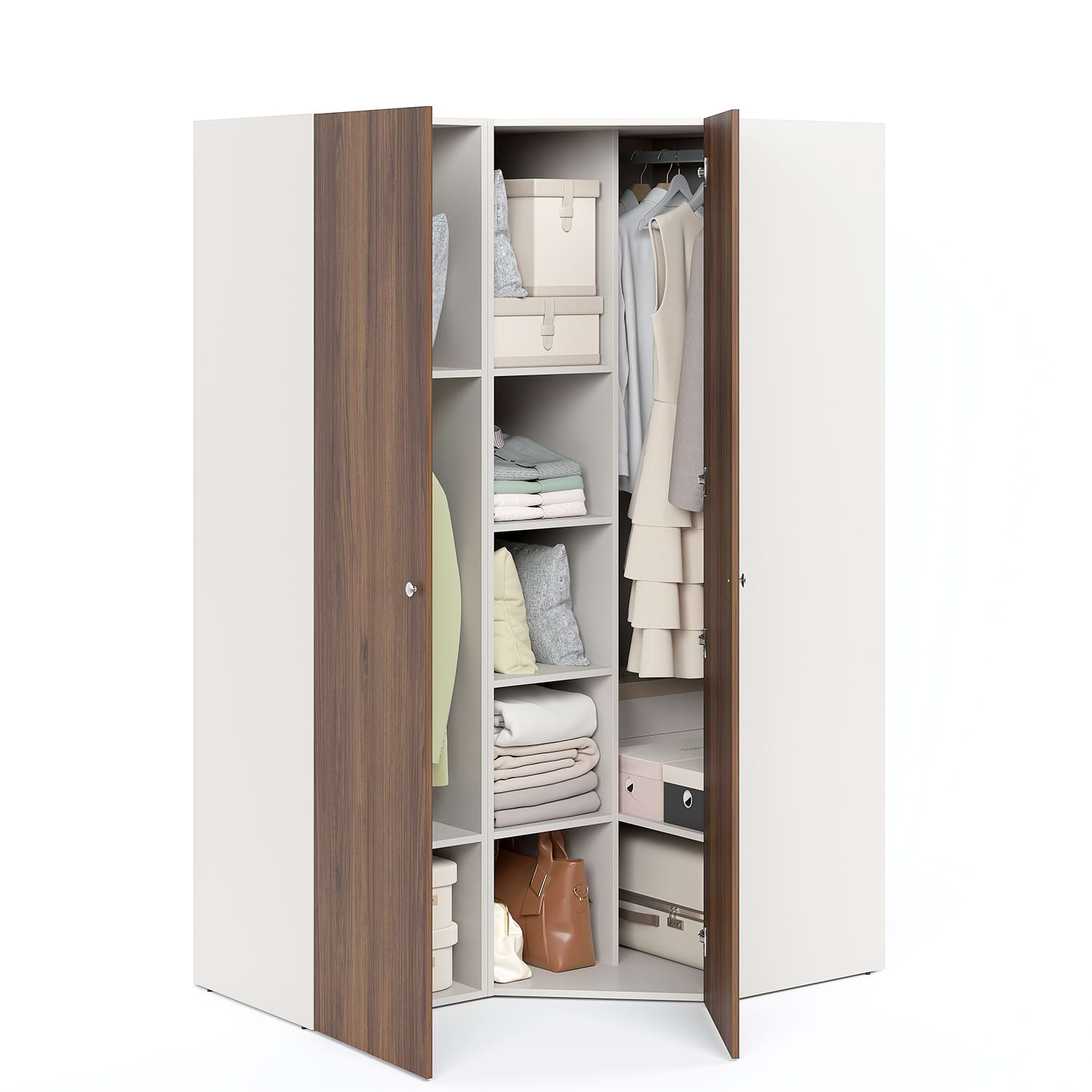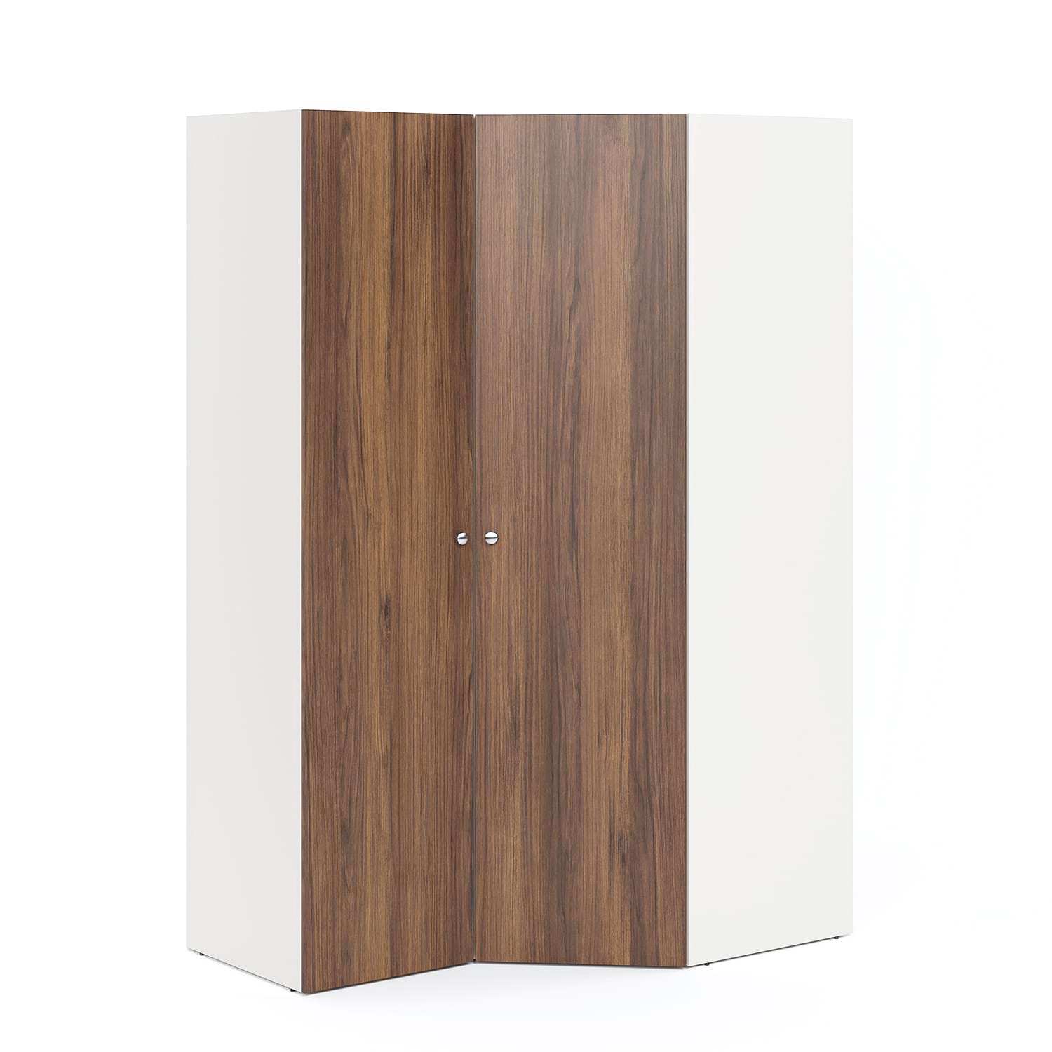 Construit din materiale de calitate superioară și echipat cu feronerie Hafele Germania, Dulapul de colt ARONA 129cm, adancime 50cm, inaltime 195cm, cu 2 usi, carcasa Alb Portelan si fronturi Nuc Warmia asigură o utilizare sigură, silențioasă și durabilă în timp.