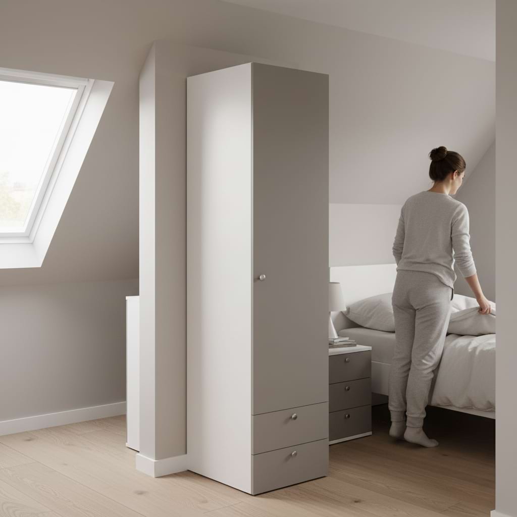 Construit din materiale de calitate superioară și echipat cu feronerie Hafele Germania, Dulap haine ARONA 90cm, adancime 50cm, inaltime 195cm, cu 1 usa 2 sertare, carcasa Alb Portelan si fronturile Gri Piatra asigură o utilizare sigură, silențioasă și durabilă în timp.