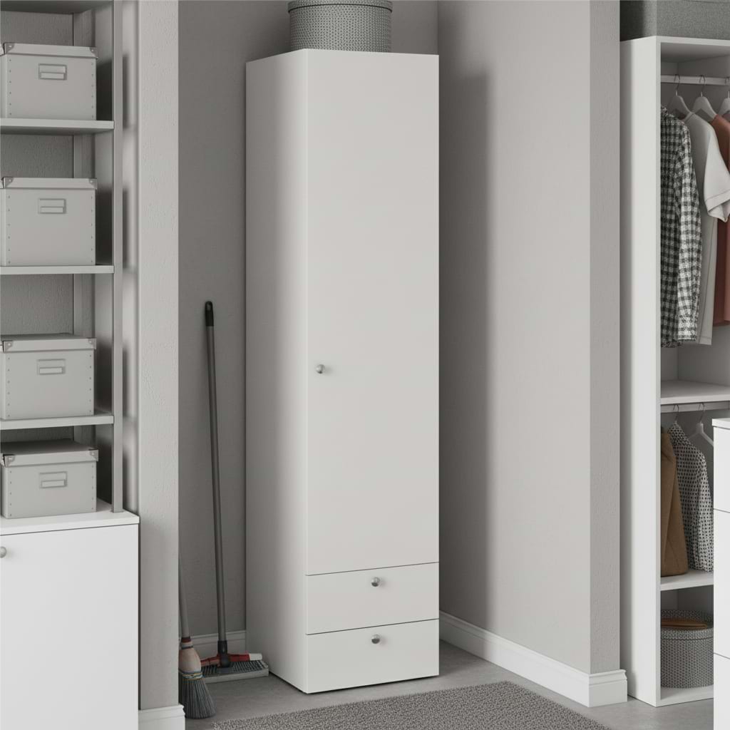 Construit din materiale de calitate superioară și echipat cu feronerie Hafele Germania, Dulap haine ARONA 45cm, adancime 50cm, inaltime 195cm, cu 1 usa 2 sertare, carcasa si front Alb Portelan asigură o utilizare sigură, silențioasă și durabilă în timp.
