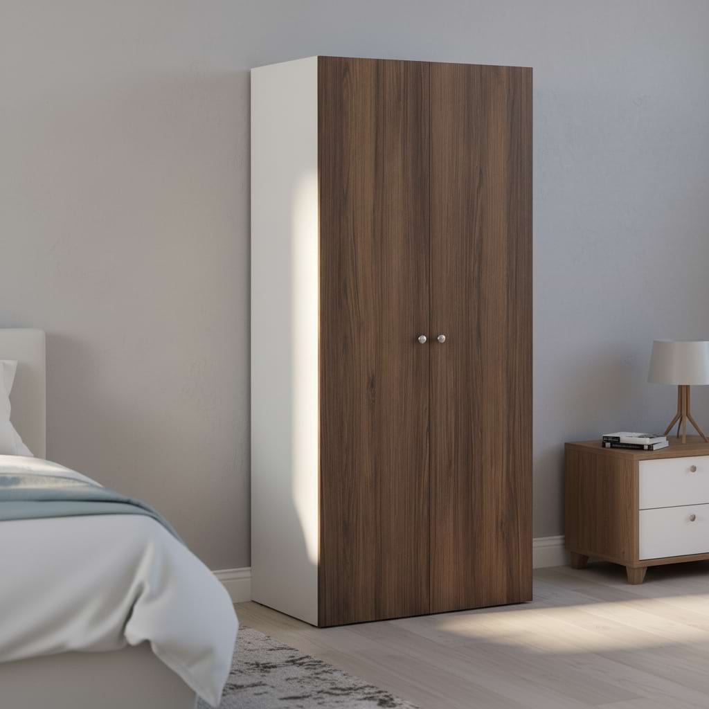 Construit din materiale de calitate superioară și echipat cu feronerie Hafele Germania, Dulap haine ARONA 90cm, adancime 50cm, inaltime 195cm, cu 2 usi, carcasa Alb Portelan si fronturi Nuc Warmia asigură o utilizare sigură, silențioasă și durabilă în timp.