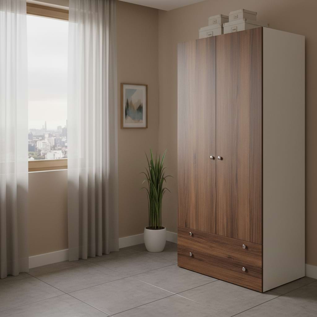 Construit din materiale de calitate superioară și echipat cu feronerie Hafele Germania, Dulap haine ARONA 90cm, adancime 50cm, inaltime 195cm, cu 2 usi si 2 sertare, carcasa Alb Portelan si fronturi Nuc Warmia asigură o utilizare sigură, silențioasă și durabilă în timp.