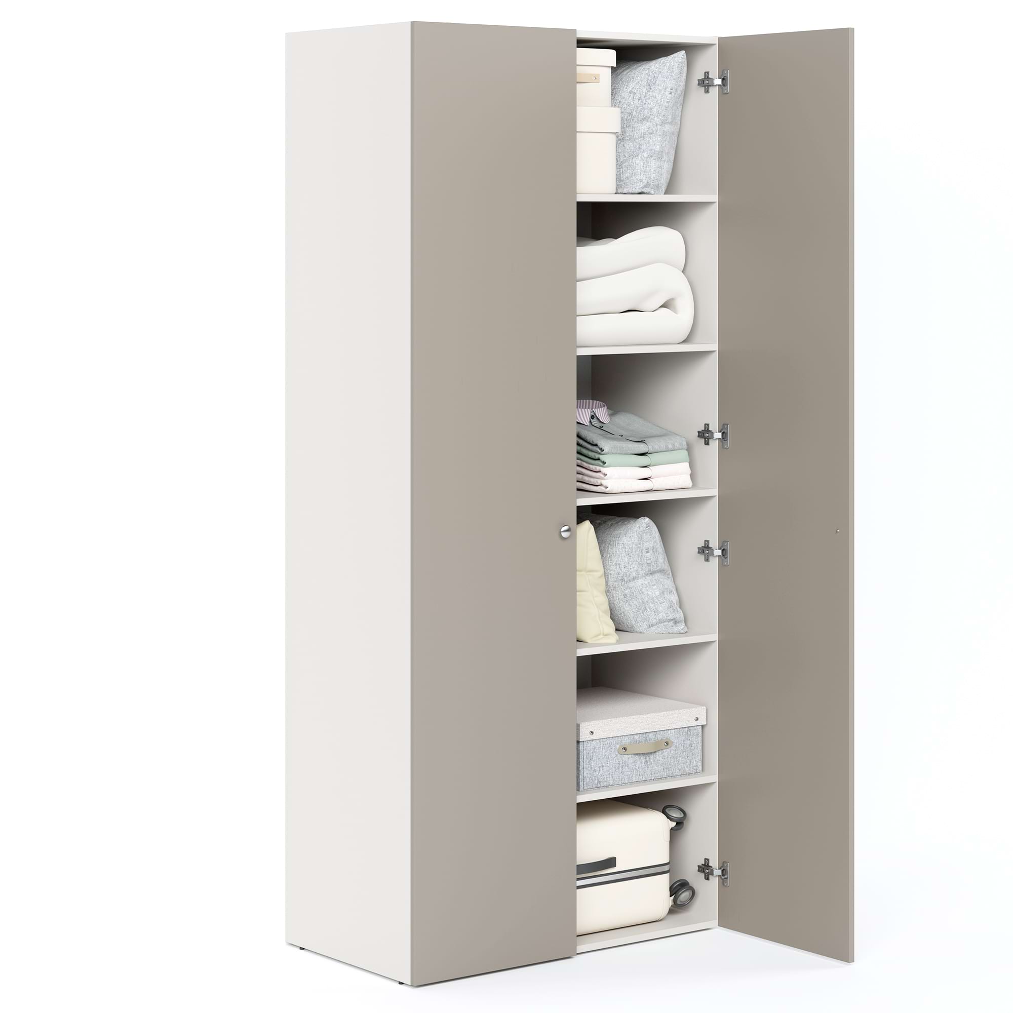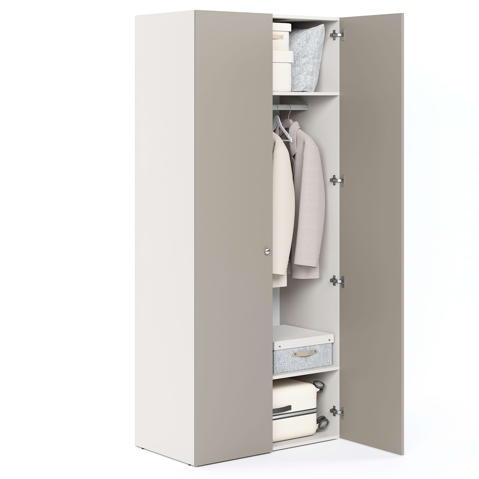 Dulap haine ARONA 90cm, adancime 50cm, inaltime 210cm, cu 2 usi, compartimentat cu bara umerase sau polite sau lift bara umerase, carcasa Alb Portelan si fronturi Gri Piatra.