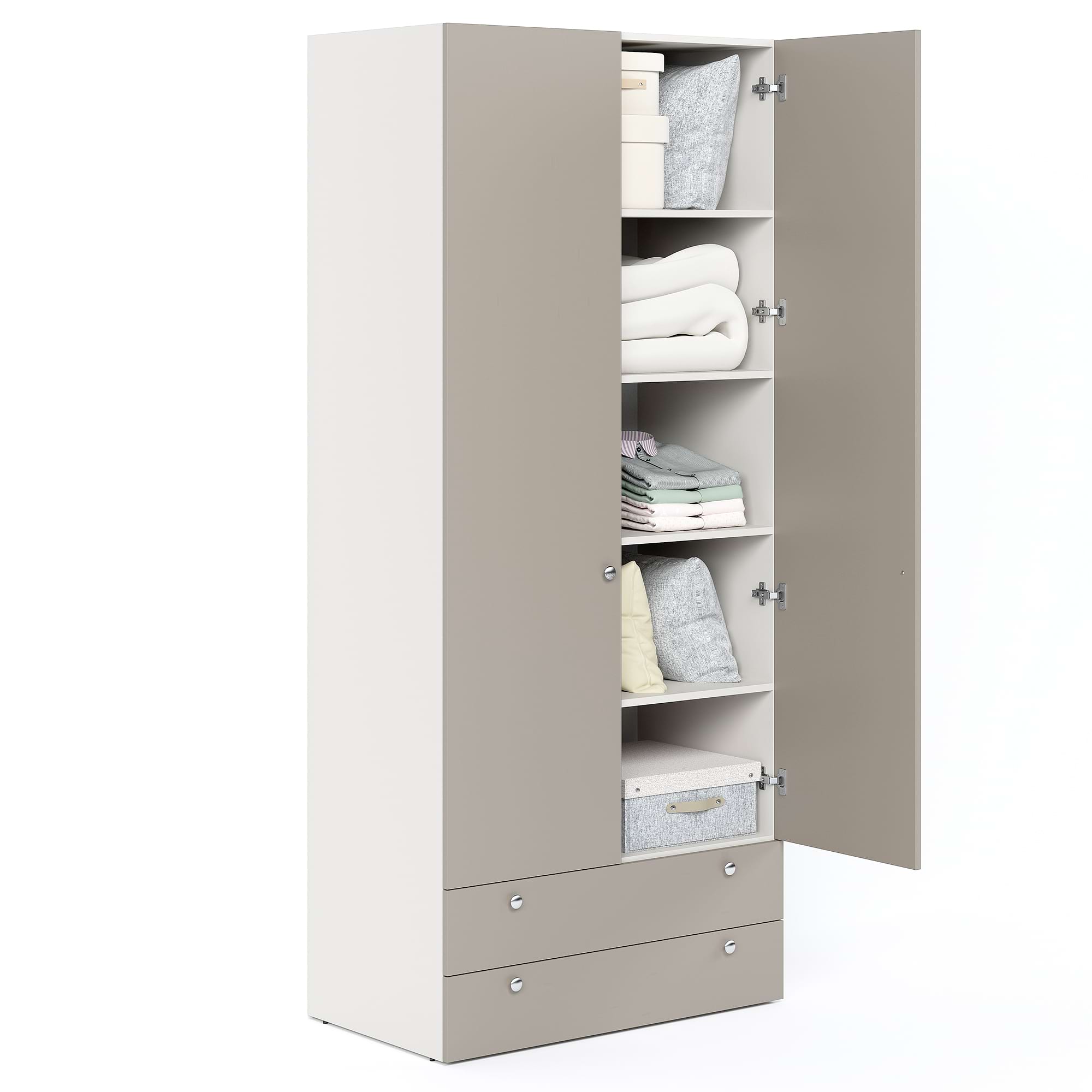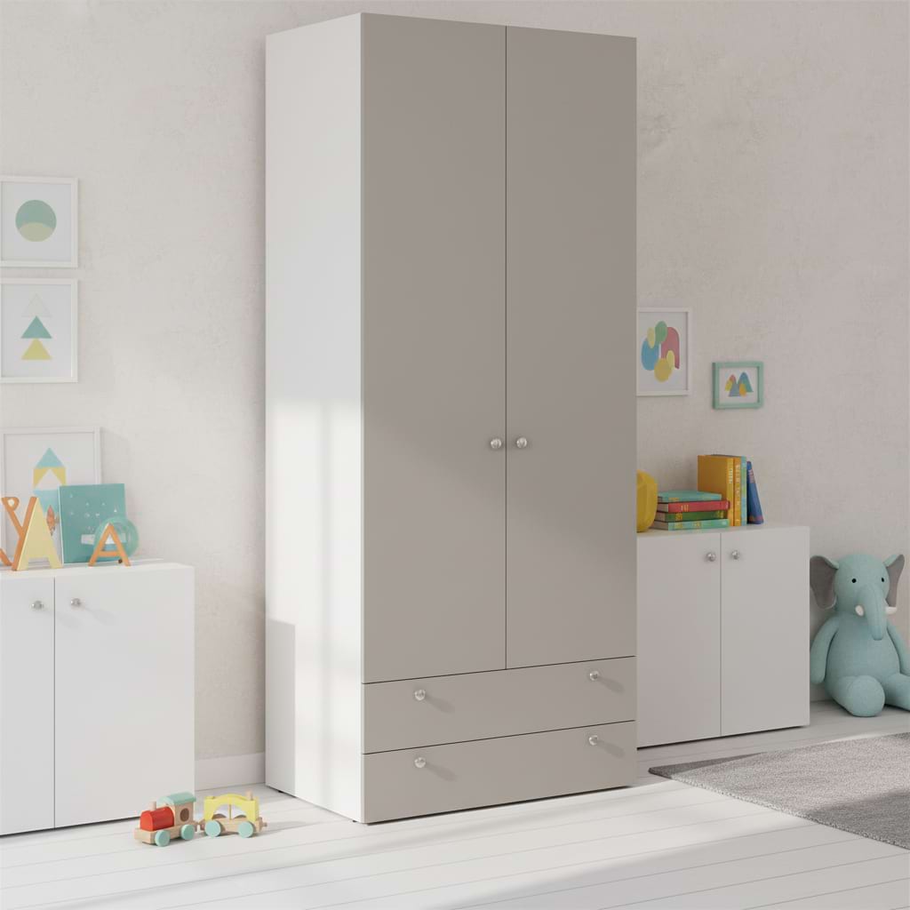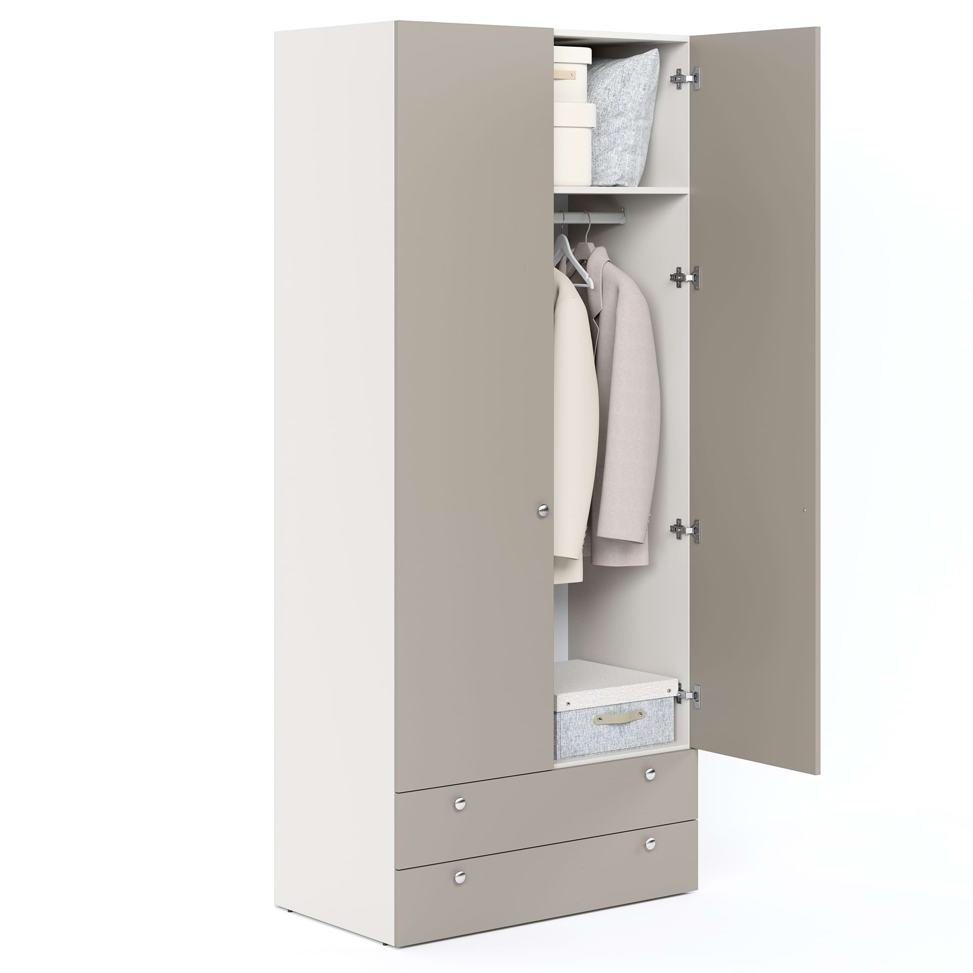 Dulap haine ARONA 90cm, adancime 50cm, inaltime 210cm, cu 2 usi si 2 sertare,  carcasa Alb Portelan si fronturi Gri Piatra.