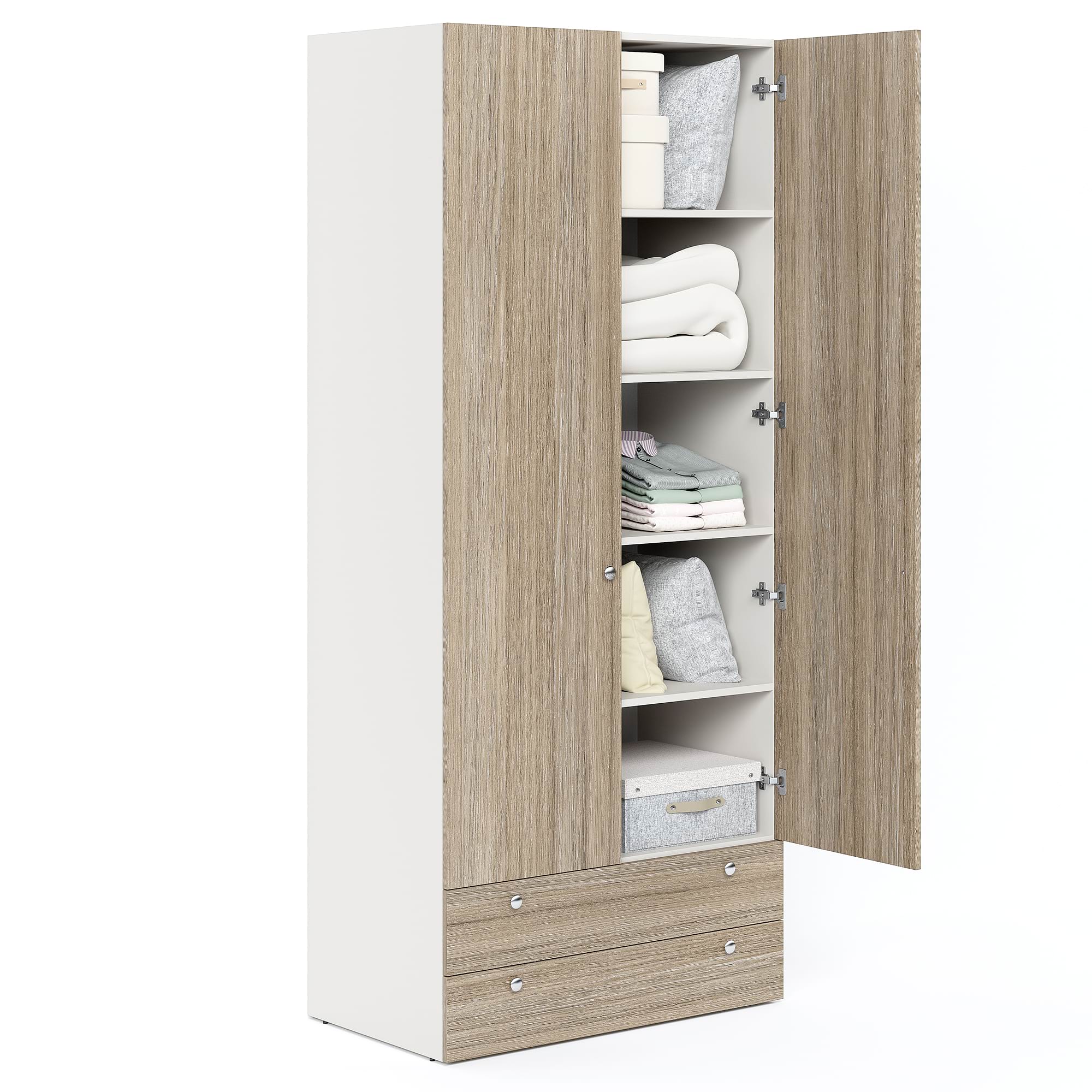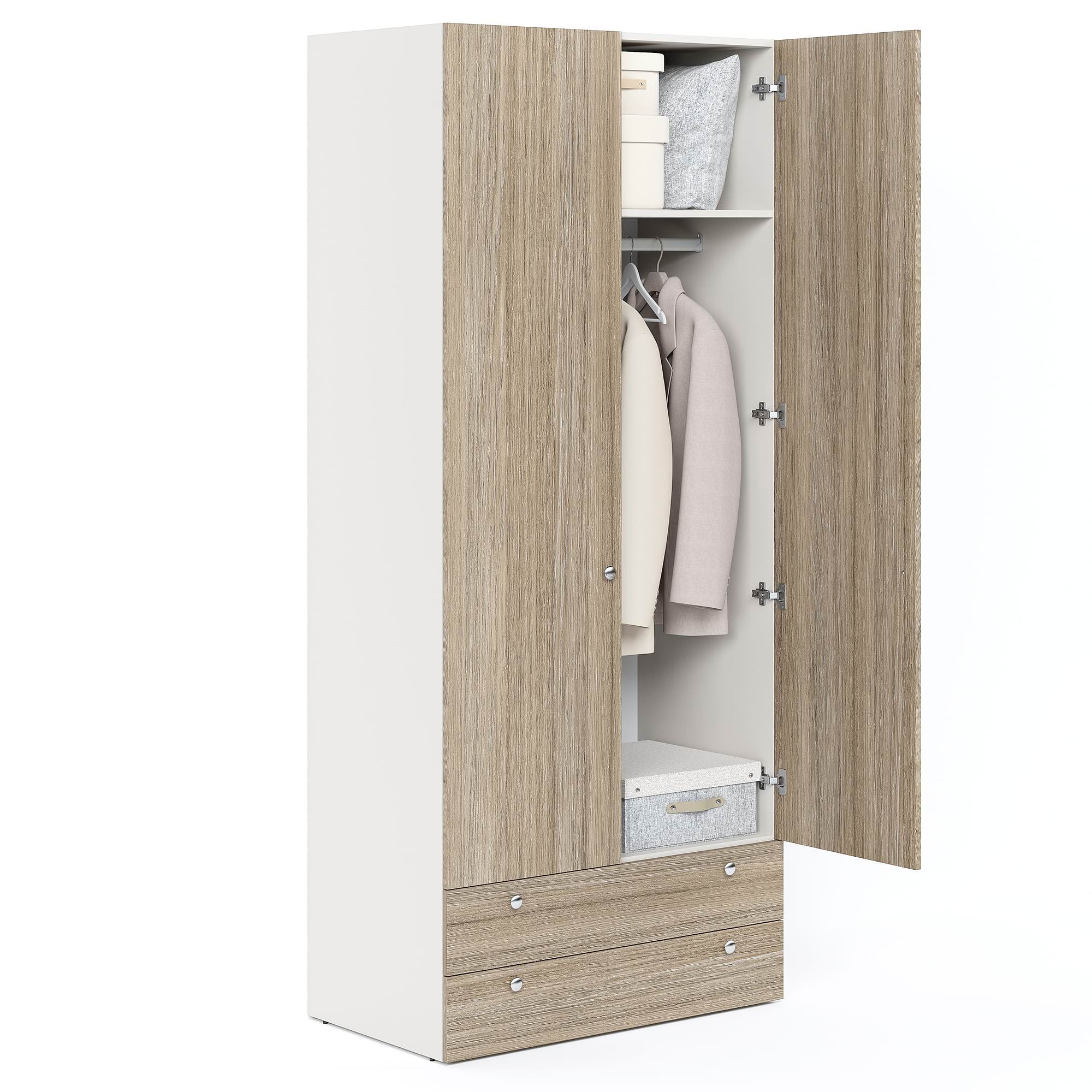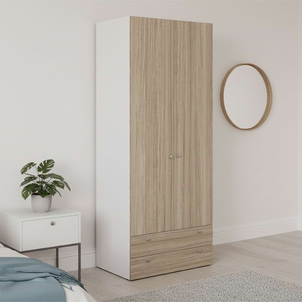 Dulap haine ARONA 90cm, adancime 50cm, inaltime 210cm, cu 2 usi si 2 sertare, carcasa Alb Portelan si fronturi Oak.
