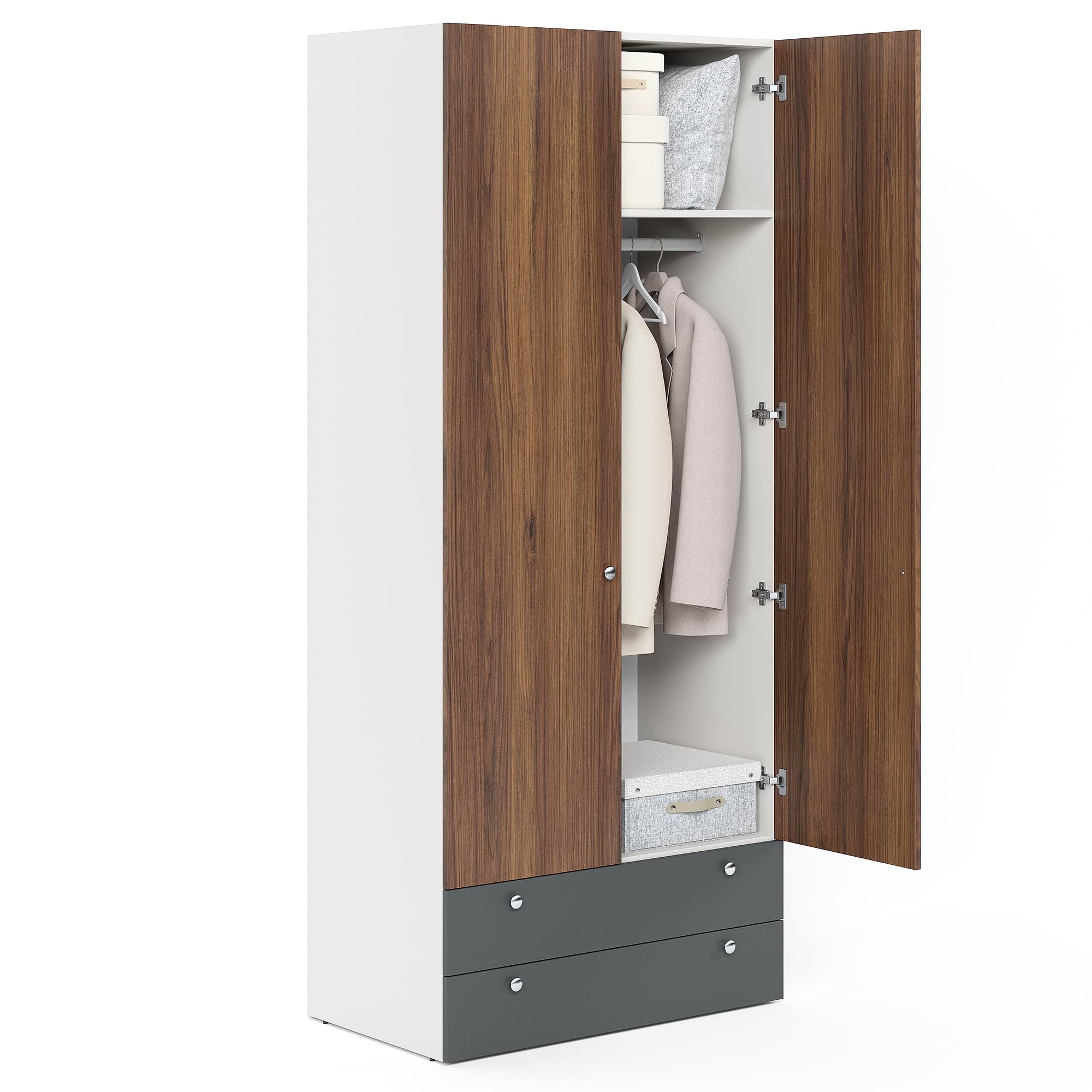 Dulap haine ARONA 90cm, adancime 50cm, inaltime 210cm, cu 2 usi si 2 sertare, carcasa Alb Portelan, fronturi usi Nuc Warmia si fronturi sertare Antracit.