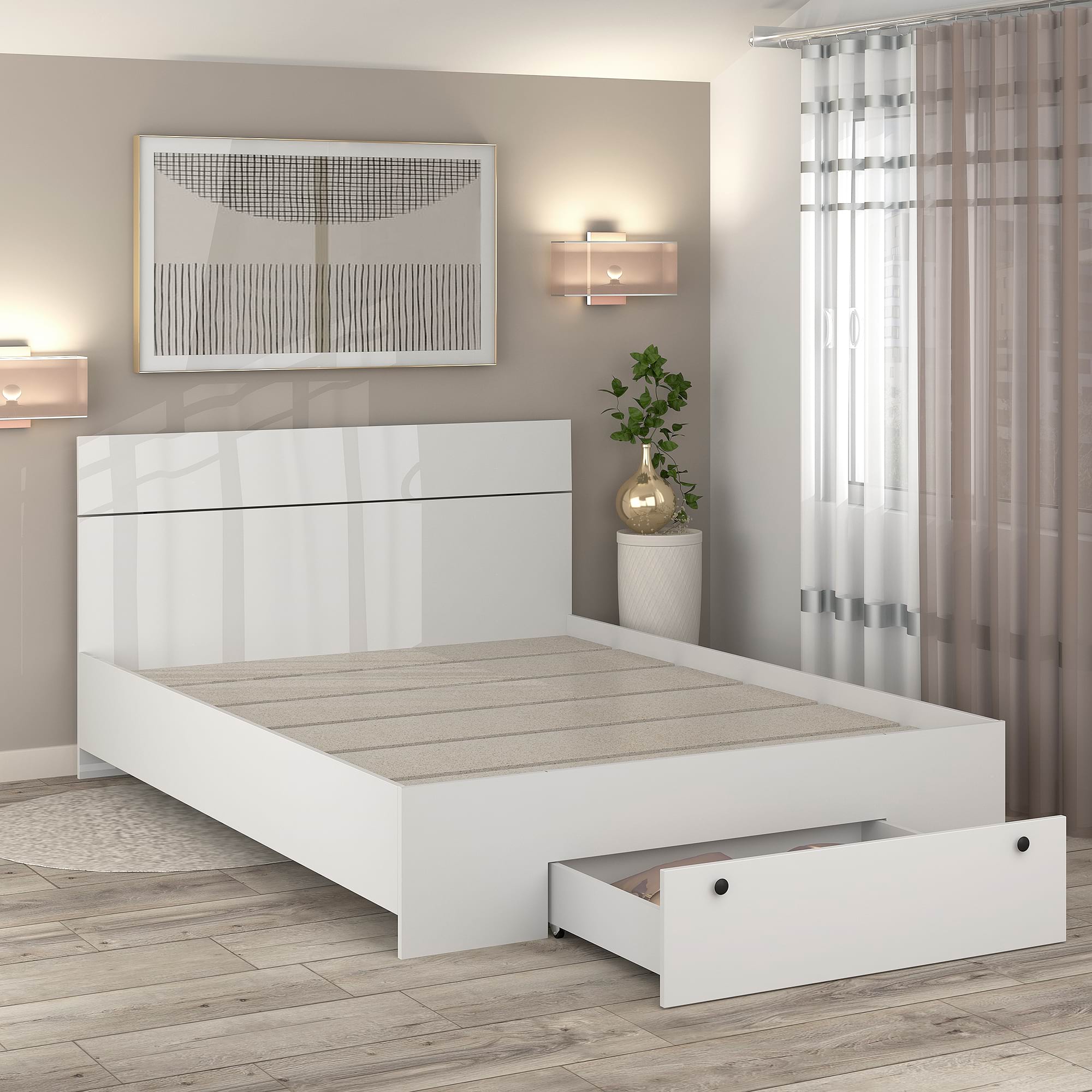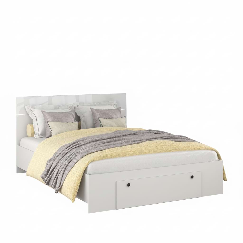 Patul AMBRO, 140x200cm cu suport saltea fix si sertar frontal, realizat din PAL Albn face parte din Colectia PRIMAVERA.