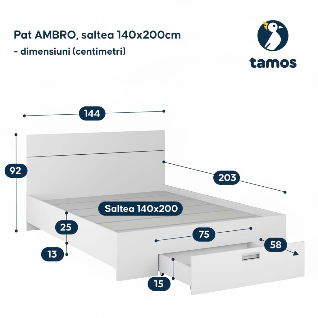 Patul AMBRO fara saltea, 140x200cm cu suport fix pentru saltea si sertar frontal, realizat din PAL Alb Portelan face parte din Colectia PRIMAVERA.